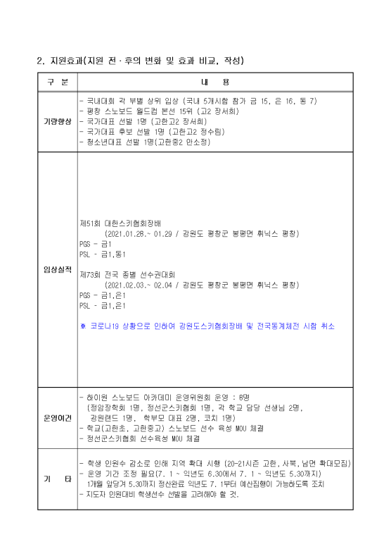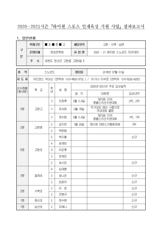 2020-2021시즌「하이원 스포츠 인재육성 지원 사업」결과보고서