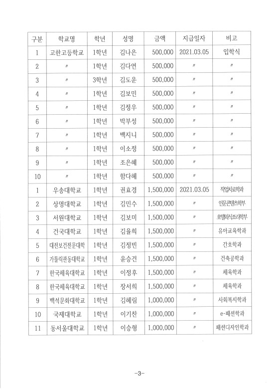 2021년 정암장학회 장학금 지급내역