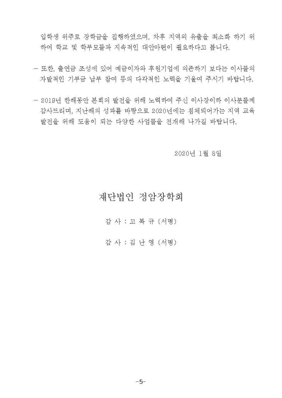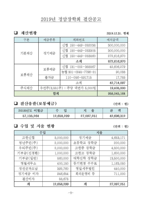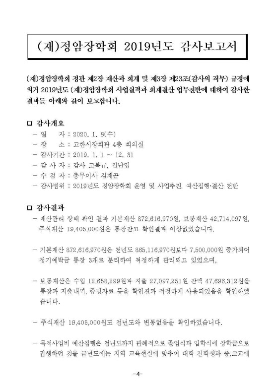2019년 정암장학회 결산공고