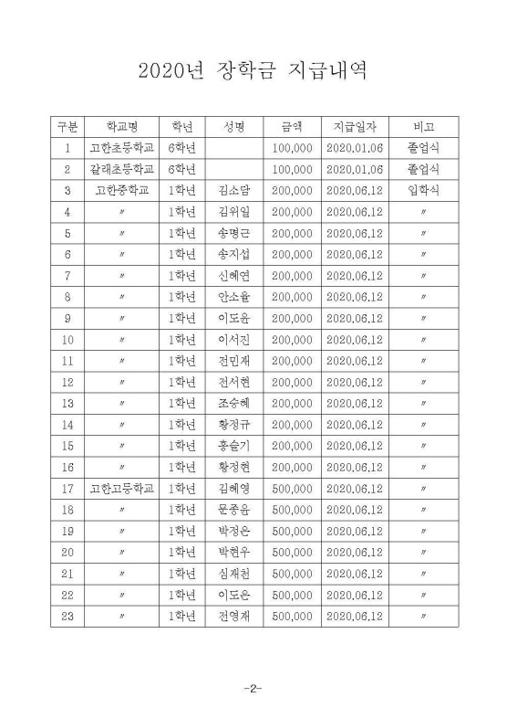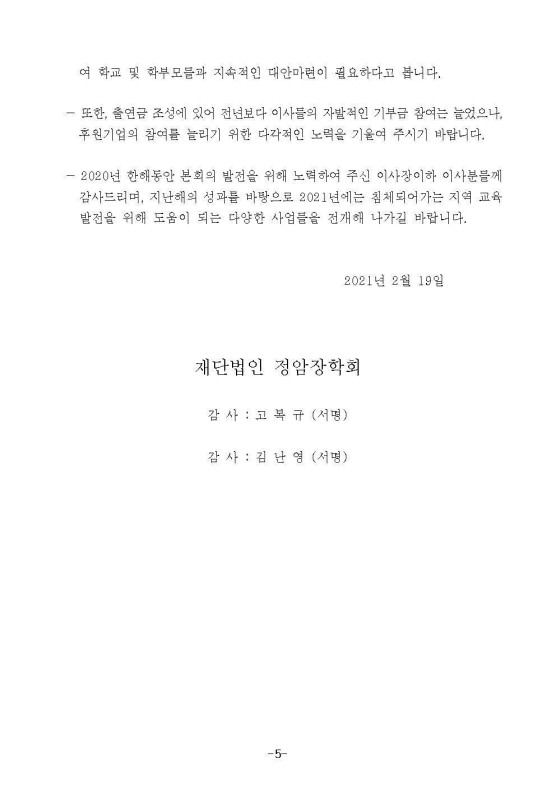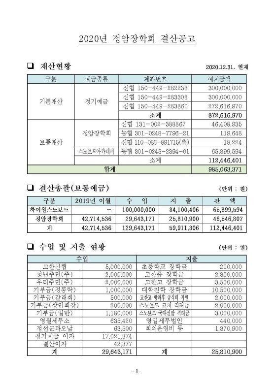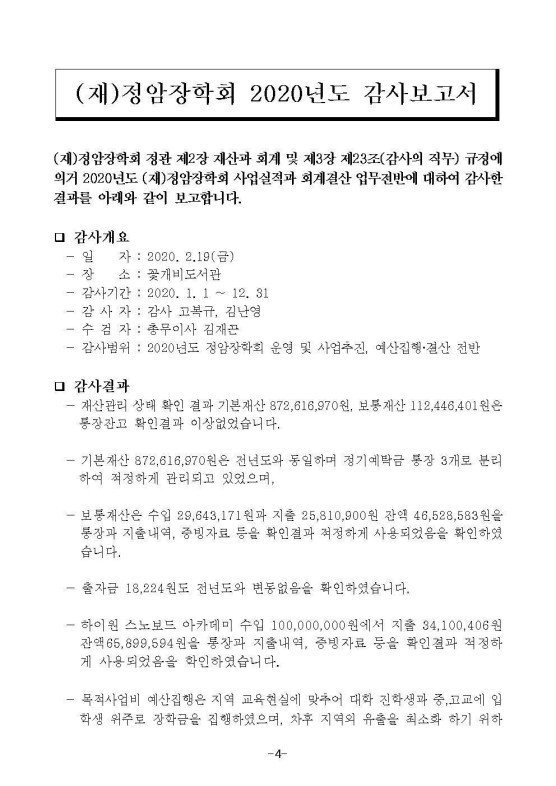2020년 정암장학회 결산공고